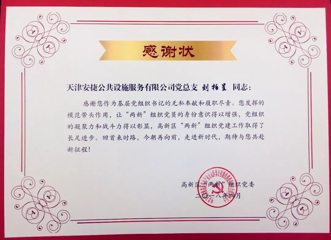 经过高新技术企业党委2017年度工作考核,天津ballbet贝博公共设施服务有限公司获得“优秀”的党组织荣誉称号,同时,ballbet贝博董事长刘柏呈同志获得“优秀”的党组织负责人荣誉称号。