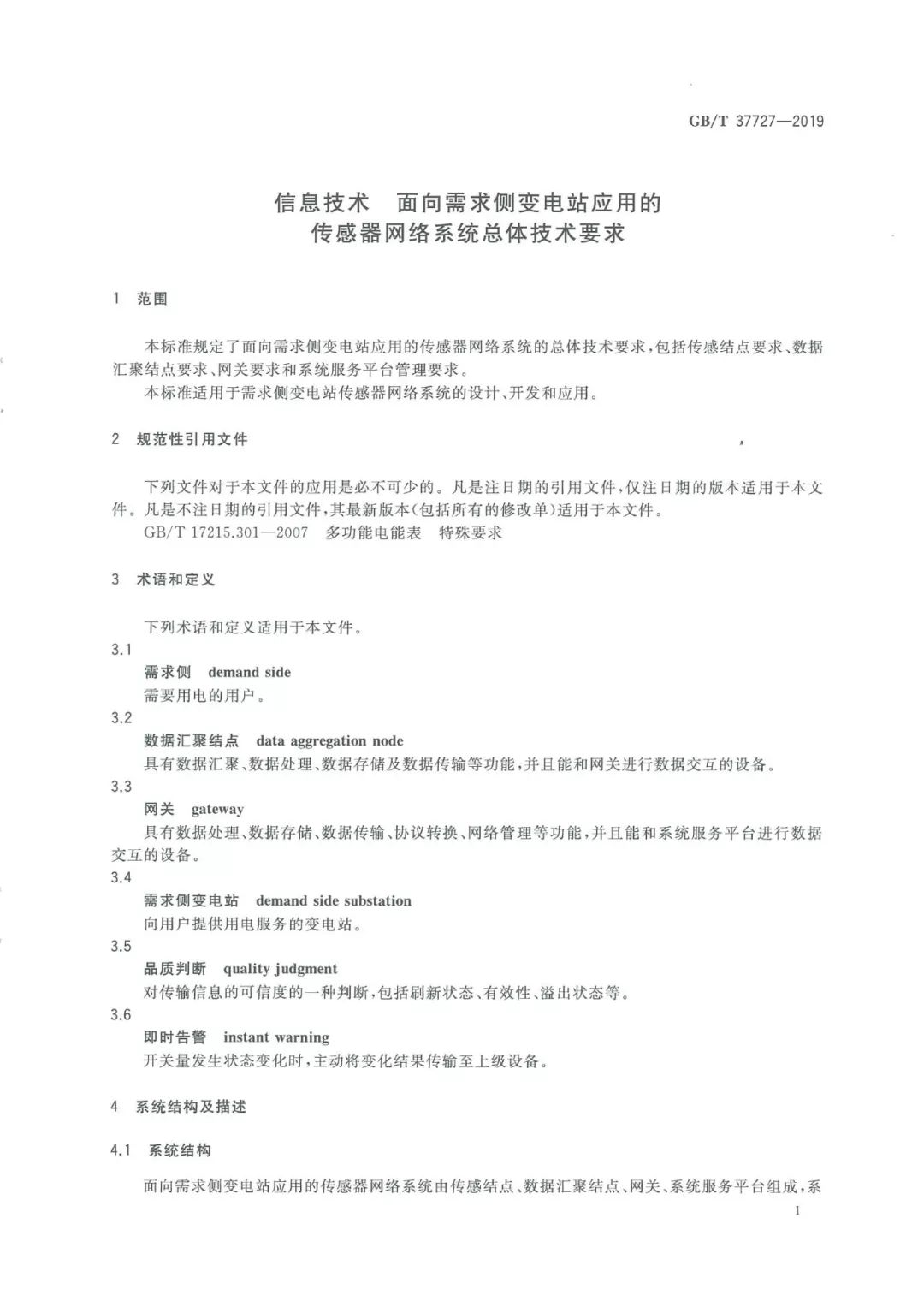 本标准作为国家推荐性标准,能够规范需求侧变电站传感网系统的总体技术要求,能够为传感网在需求侧变电站的大规模推广应用奠定重要基础。