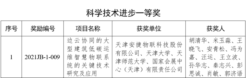日前,2021年天津市科学技术奖获奖名单公布,由天津ballbet贝博物联科技股份有限公司联合天津大学、天津师范大学、国家会展中心(天津)有限责任公司申报的《边云协同的大型建筑低碳运维智慧物联系统的关键技术研究及应用》项目,荣获“天津市科学技术进步一等奖”。