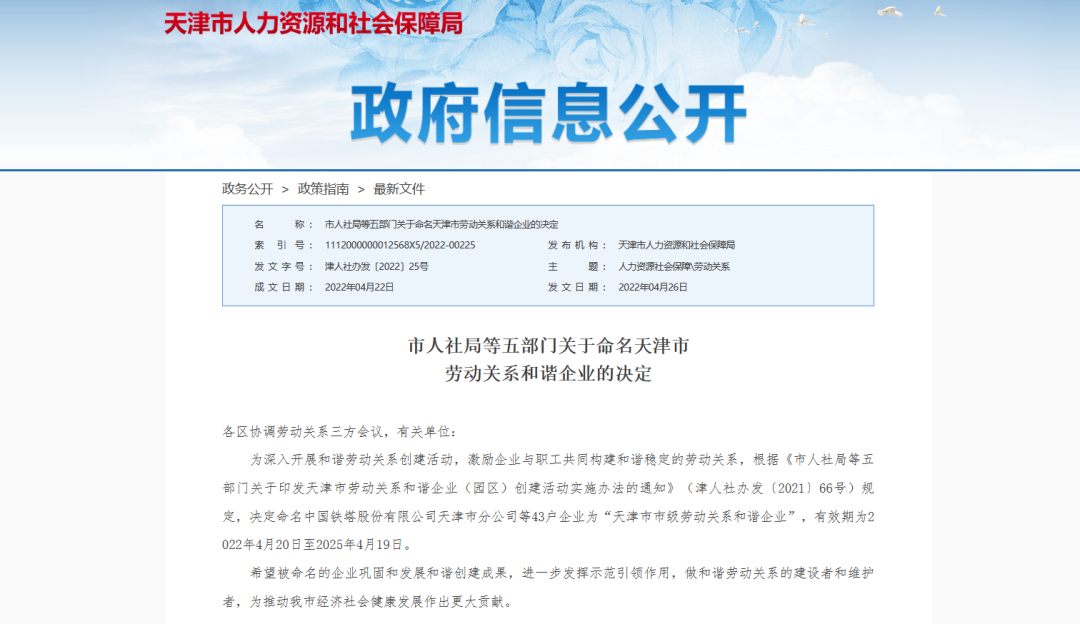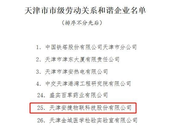 2022年4月26日,天津市人力资源和社会保障局发布了《市人社局等五部门关于命名天津市劳动关系和谐企业的决定》,命名天津ballbet贝博物联科技股份有限公司等43户企业为“天津市市级劳动关系和谐企业”,有效期为2022年4月20日至2025年4月19日。